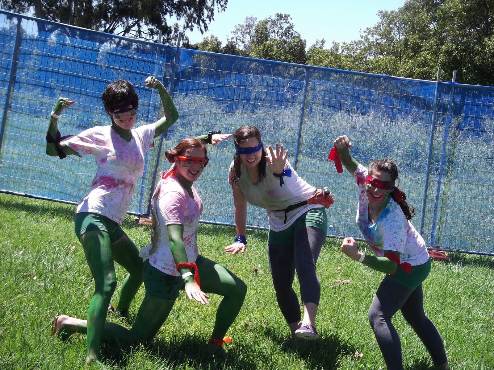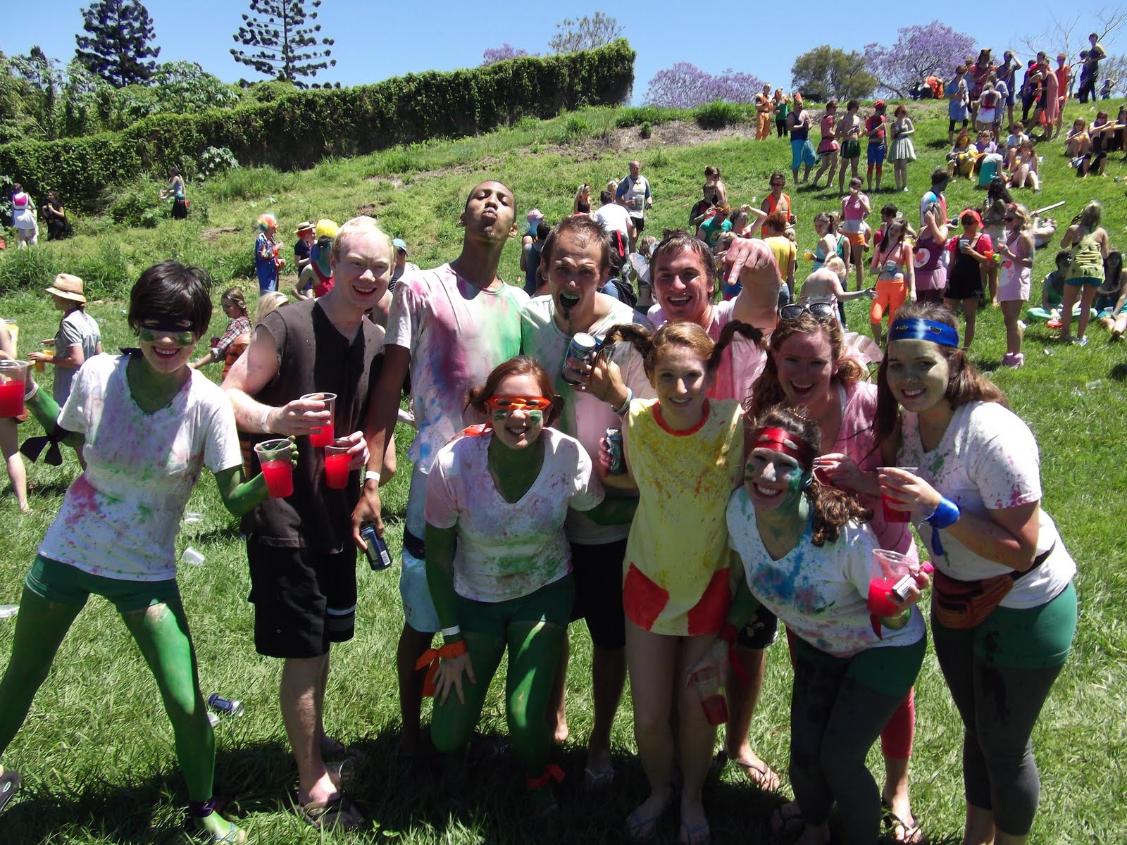 I woke up nice and early the next morning to begin suiting up for ICC Recovery. Now I have already written a post about Cromwell recovery, but here's the difference between the two. ICC recovery is open to all college students and is held in a field for an entire day. They serve goon and juices, UDLs (mixed drinks in a can), and beer and lunch about halfway through. Music was going constantly. The theme was Incredible Cartoon Characters and Hannah, Liz, Megan and I dressed as the Teenage Mutant Ninja Turtles. We made masks out of ribbon and got green briefs to wear. Megan and I created shells out of the package her mom sent her (cough hint hint mom) and then painted our entire bodies green. This was one of our best decisions because had I not put paint all over I would have gotten the worst sunburn of my life, like Phil. Instead I just got a stupid looking burn on my face and the back of my neck. The greatest part of ICC Recovery was the tradition of spitting colored alcohol at each other. Yes, this is disgusting and unsanitary, but it is SO MUCH FUN. You bring colored food die with you to the event and then pour some in every drink you get. Then, you spit. Or pour, or dump out entirely on your friends. It was great, a typical Australian afternoon.
